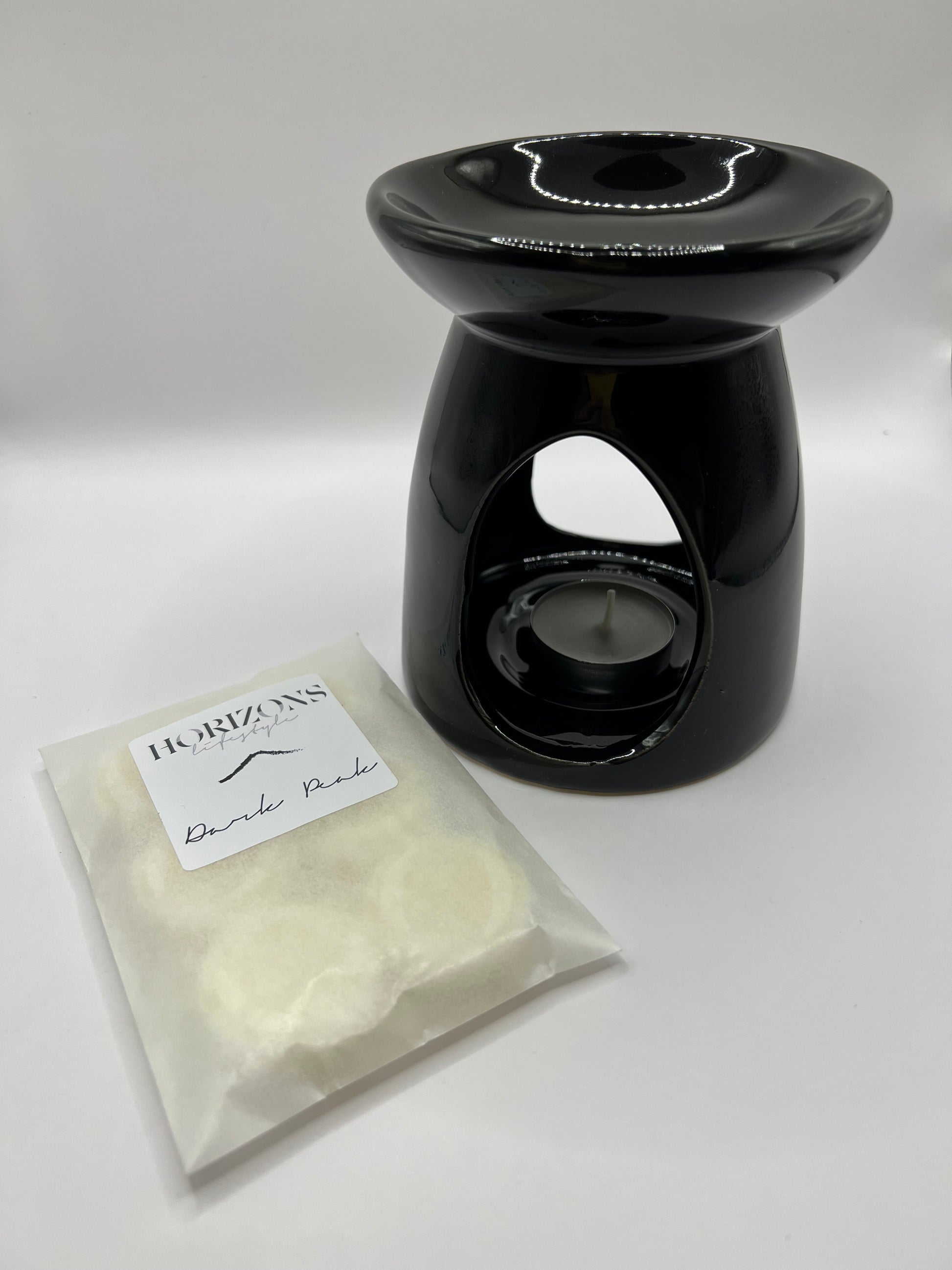 6 scented wax melts and a beautiful black ceramic wax burner, the perfect gift.